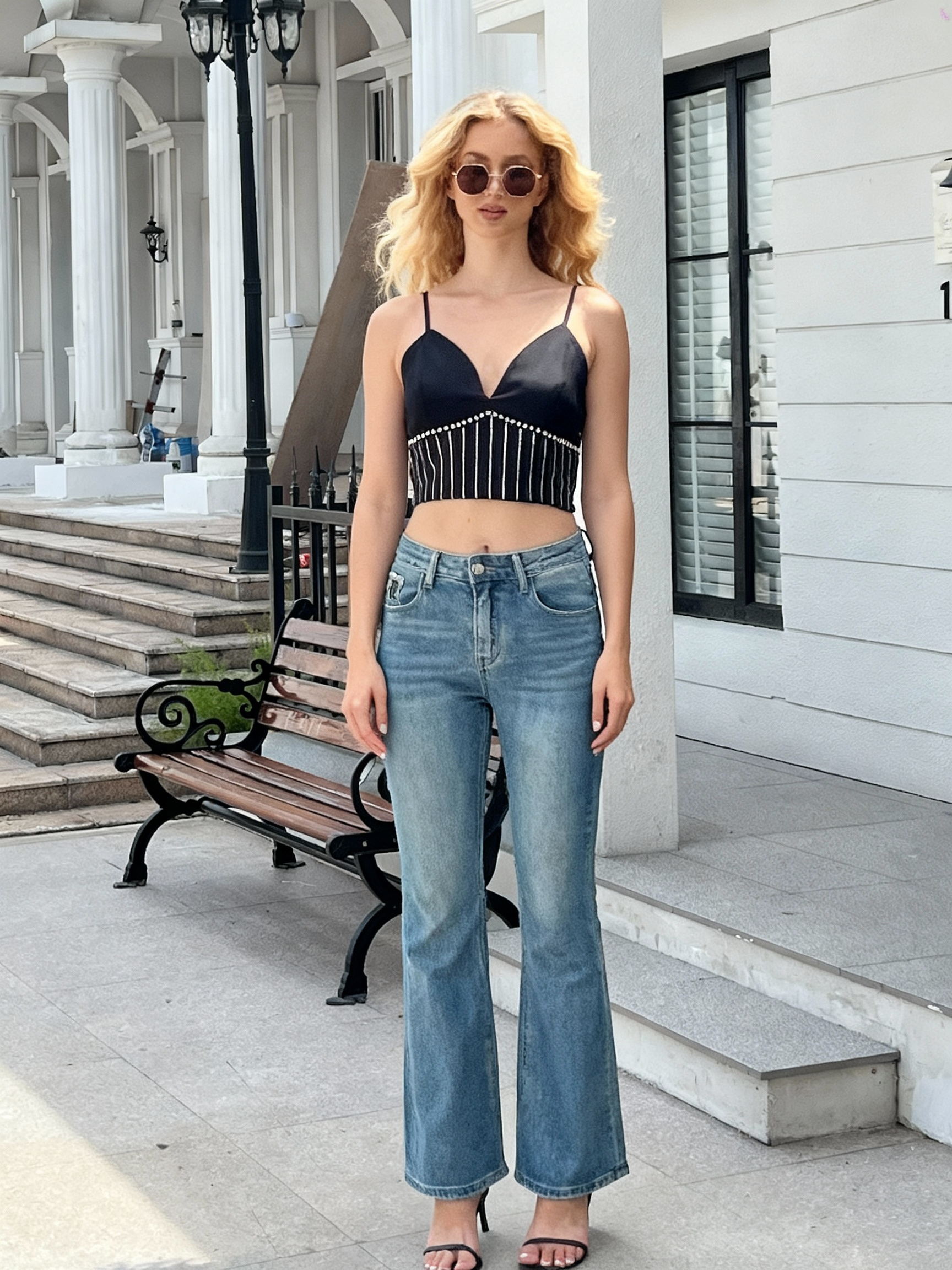 Women's Black Rhinestone Decorated Camisole Crop Top + Flared Jeans Set, Party-style Retro Metallic Accent Two-piece Outfit