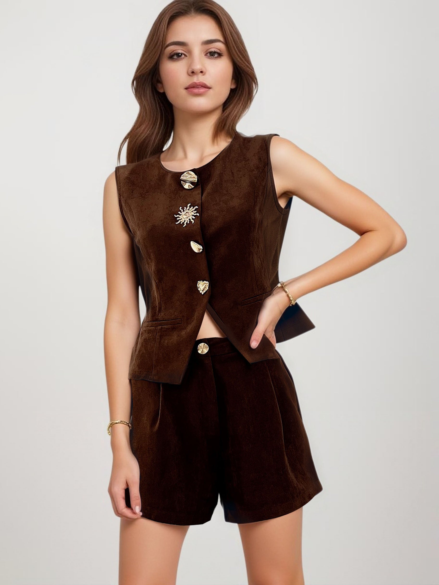Women's Brown Suede-Like Decorative-Button Sleeveless Vest + Shorts Two-Piece Set