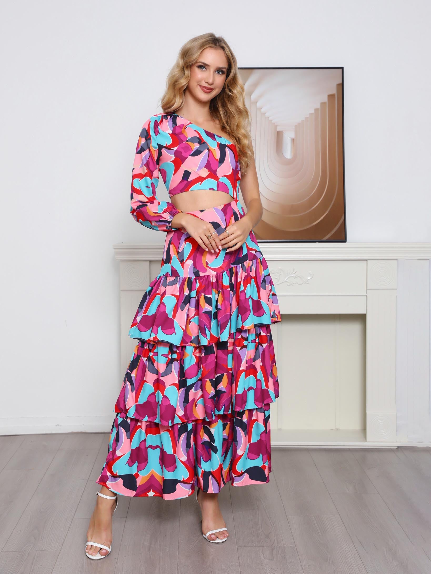 Women's Colorful Geometric Print One-shoulder Crop Top + Ruffled Maxi Skirt Set, Retro Bohemian-style Two-piece Outfit