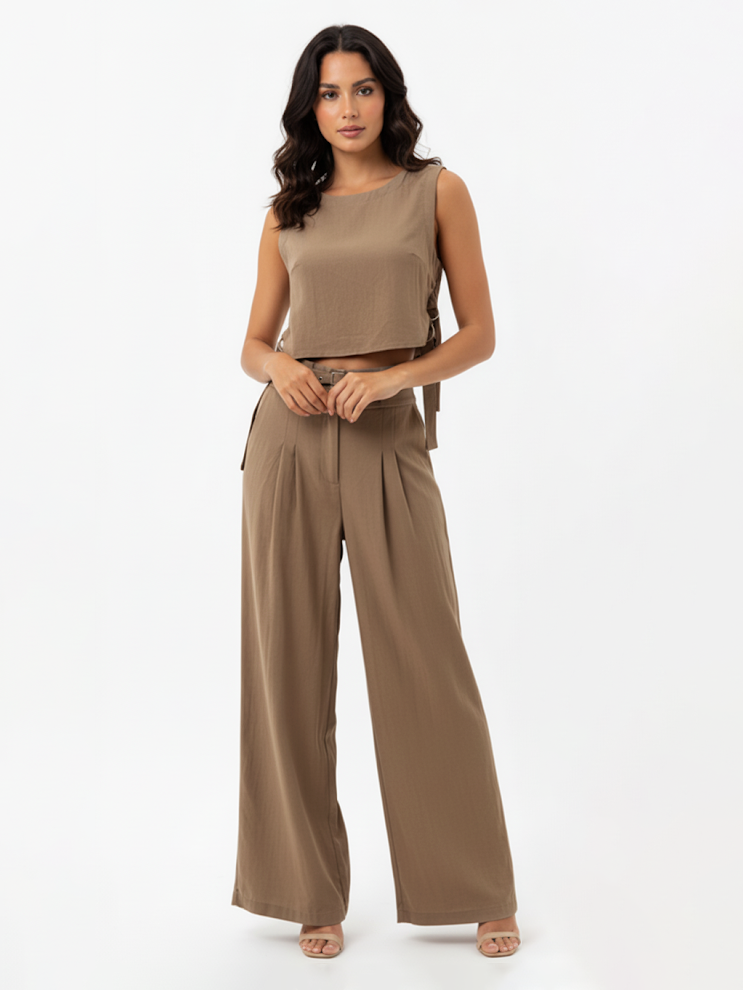 Women's Khaki Sleeveless Cropped Top + High-waisted Wide-leg Pants Set, Retro-style Minimalist Slimming Two-piece Outfit