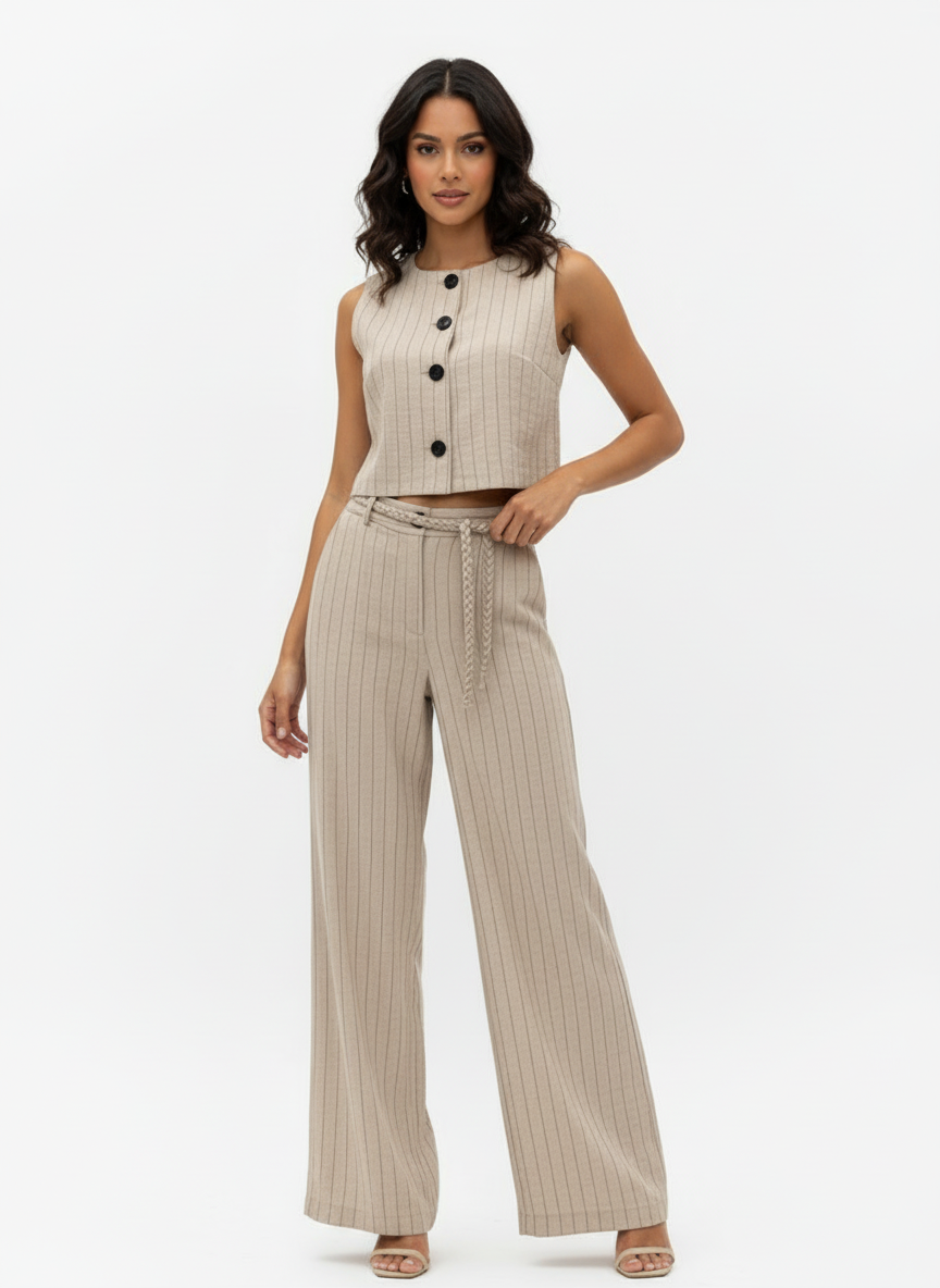 "Women's Khaki Vertical Stripe Single-breasted Sleeveless Cropped Top + High-waisted Wide-leg Pants Set, Retro-style Smart Slimming Two-piece Outfit "