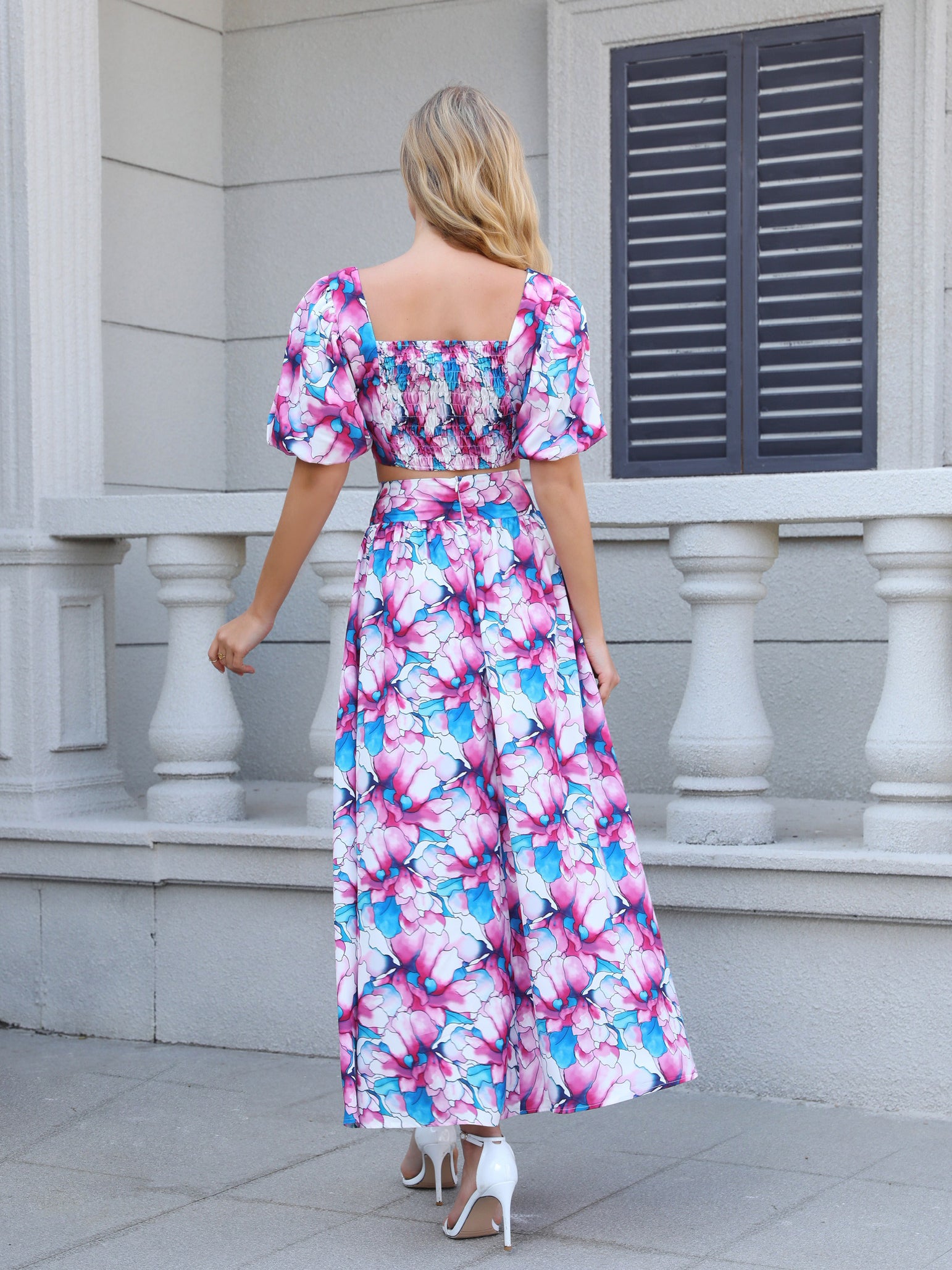Women's Pink and Blue Floral Puff Sleeve Crop Top + Slit Maxi Skirt Set, Holiday-style Sweet Waisted Two-piece Outfit