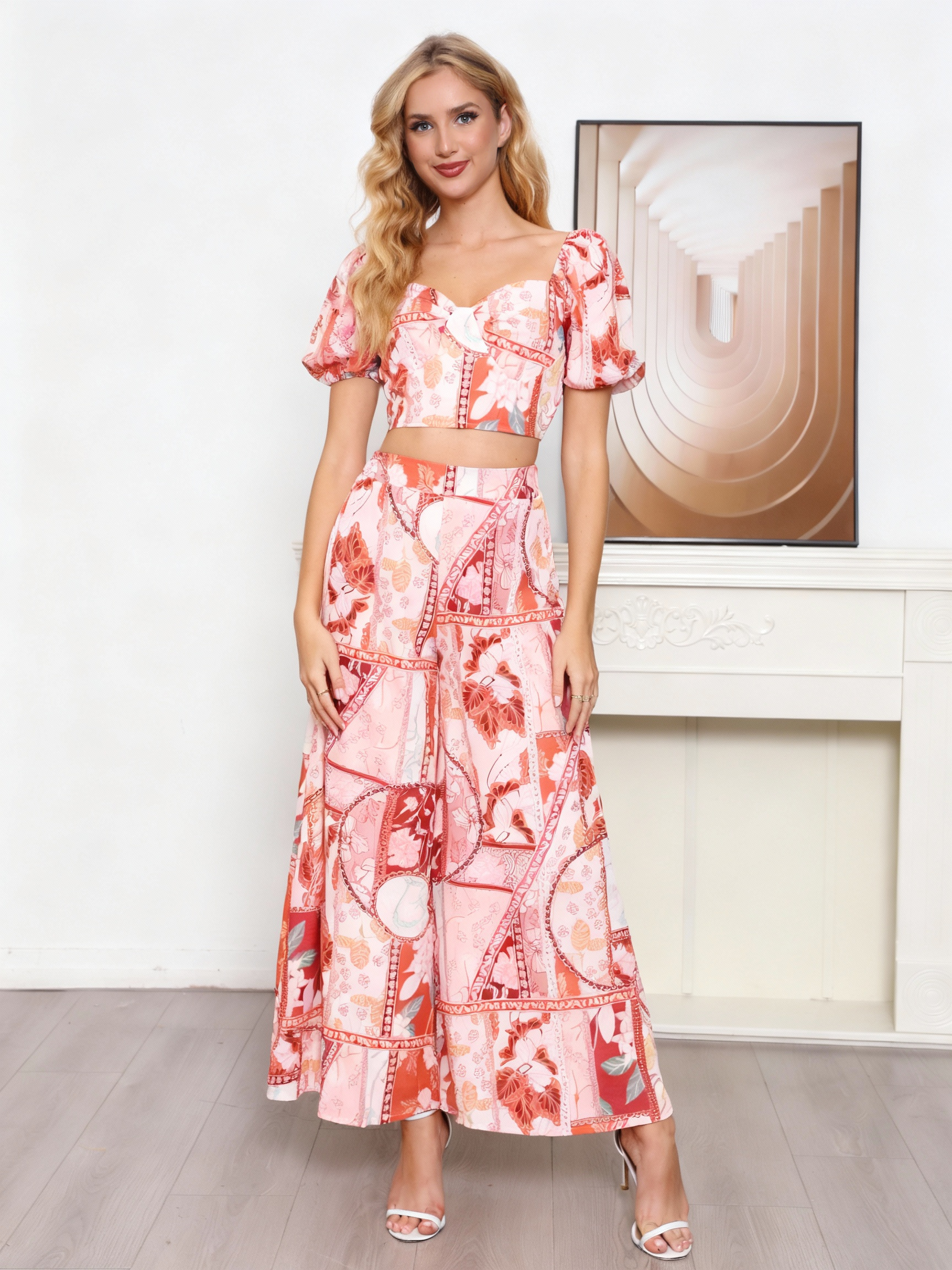 Women's Pink and Orange Floral Patchwork Puff Sleeve Crop Top + Wide-leg Pants Set, Holiday-style Sweet Waisted Two-piece Outfit