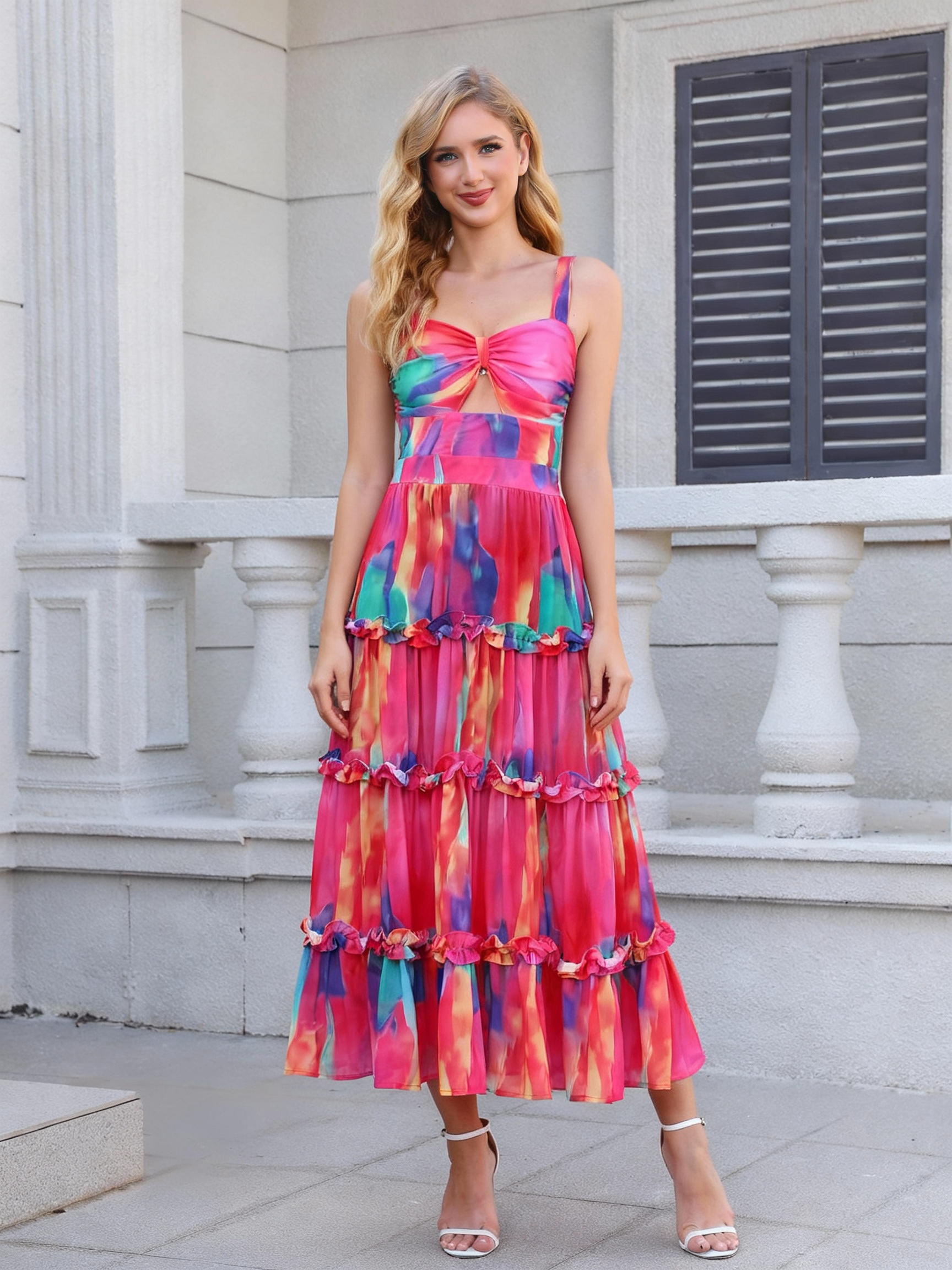 Women's Rainbow Tie-dye Ruffled Camisole Maxi Dress, Holiday-style Sweet Waisted Midi Dress