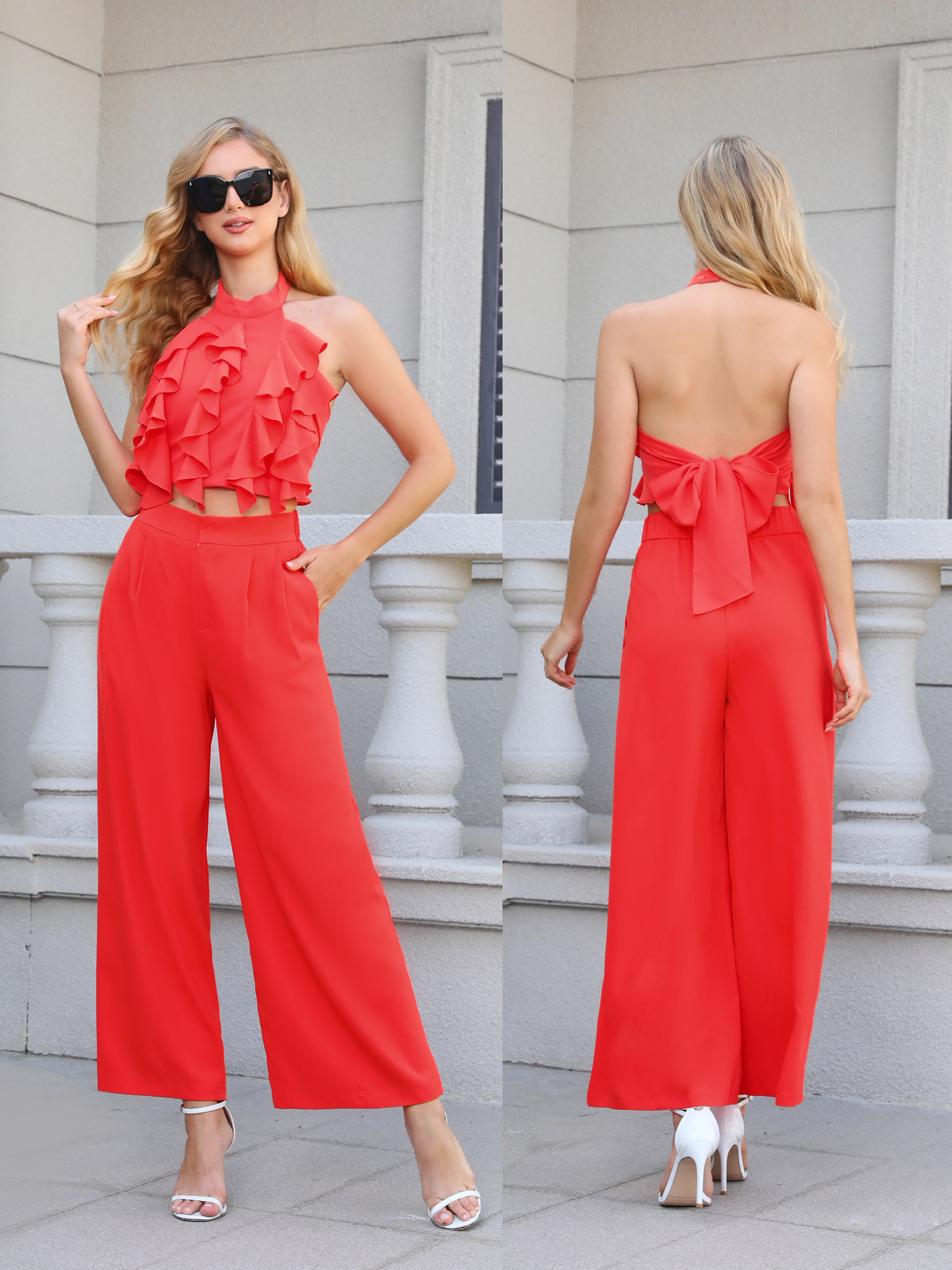 Women's Red Ruffled Halter Crop Top + Wide-leg Pants Set, Party-style Sweet Waisted Two-piece Outfit