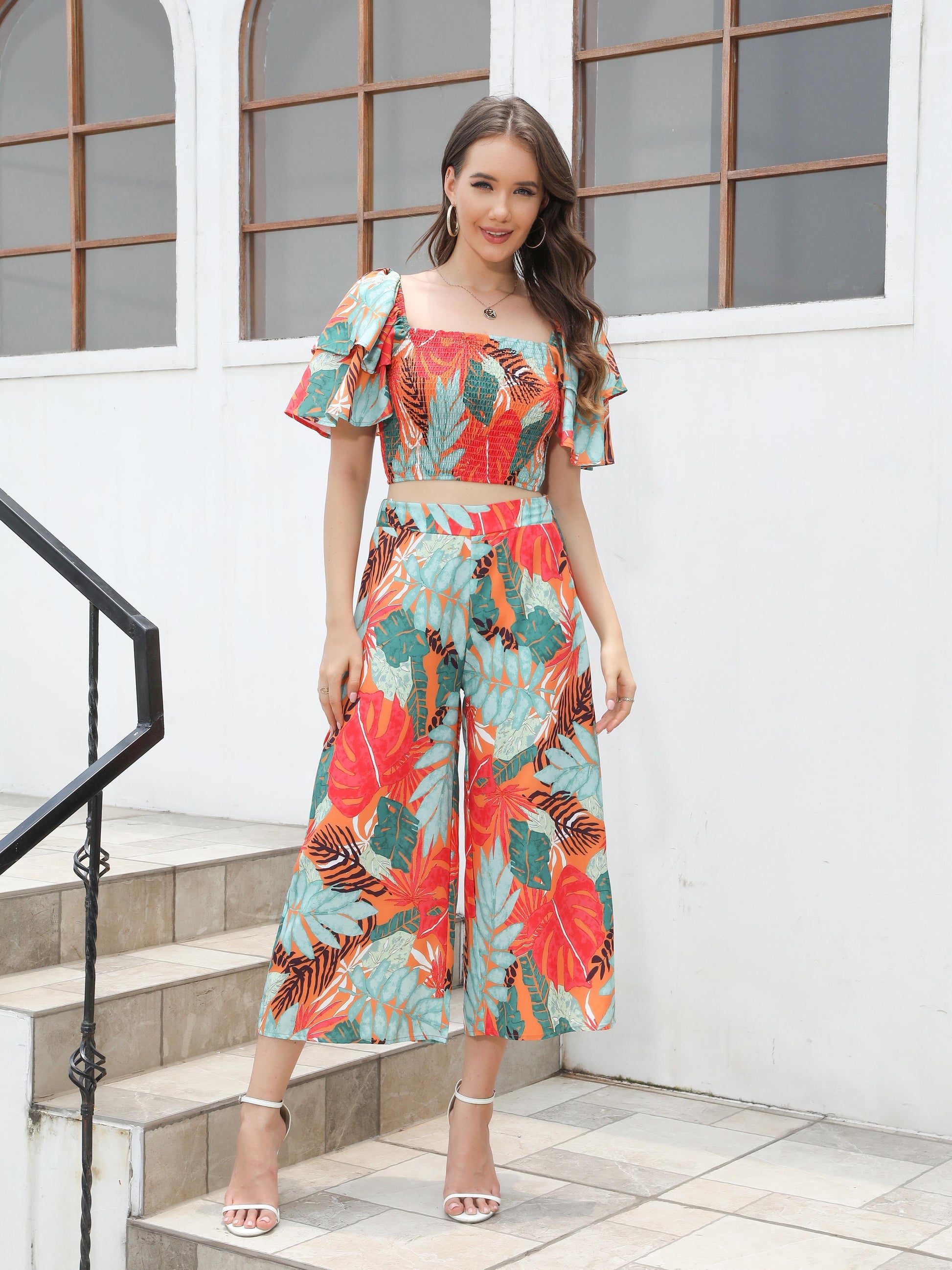 Women's Tropical Plant Print Ruffled Square Neck Cropped Top + Wide-leg Pants Set, Holiday-style Sweet Slimming Two-piece Outfit