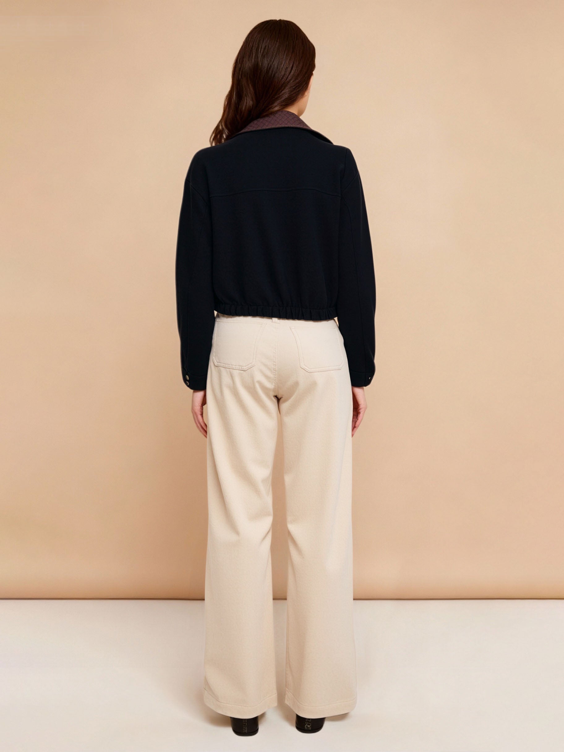 Conjunto de duas peças feminino, jaqueta curta preta com painéis em cores contrastantes + calça bege de perna larga