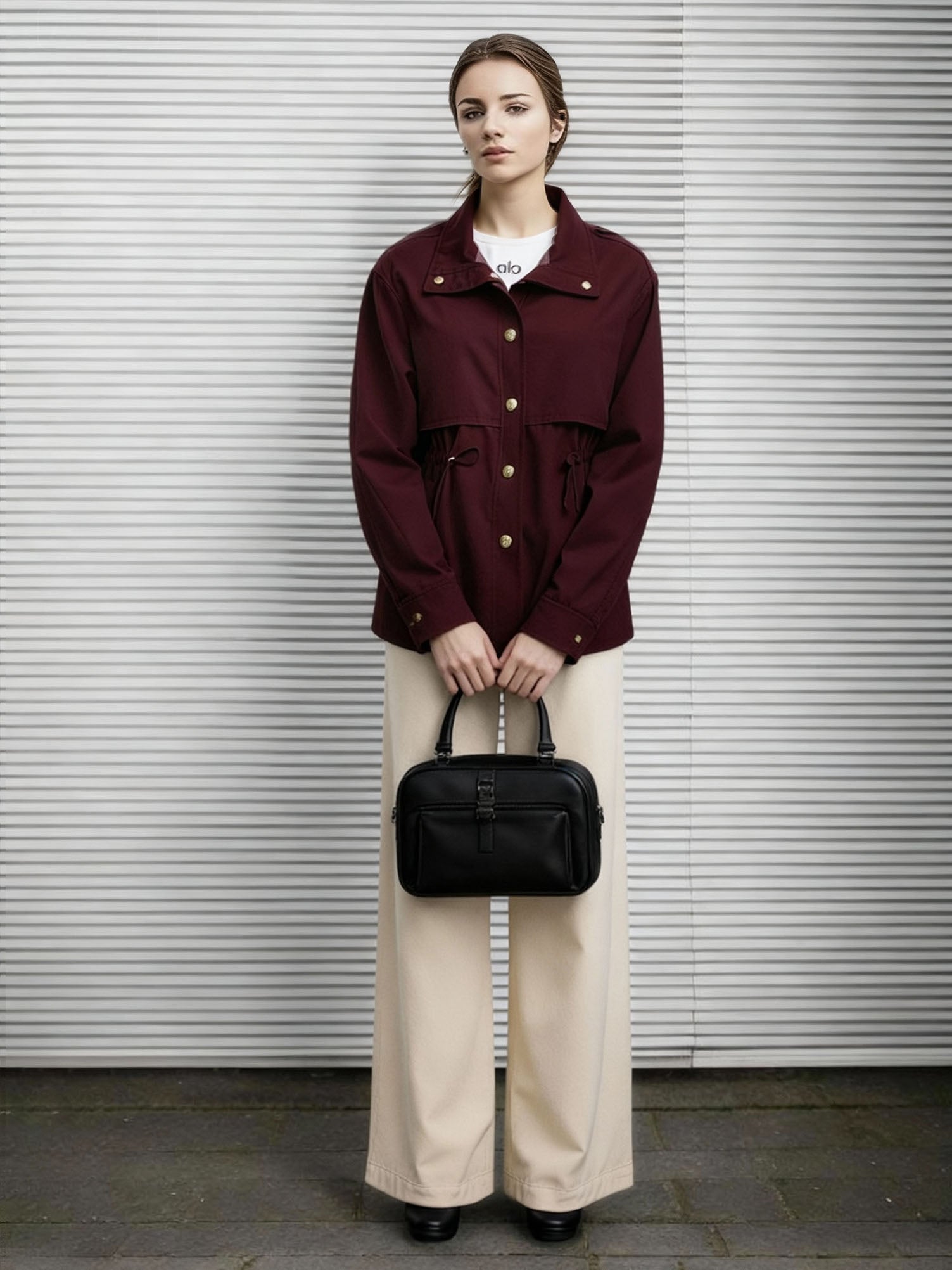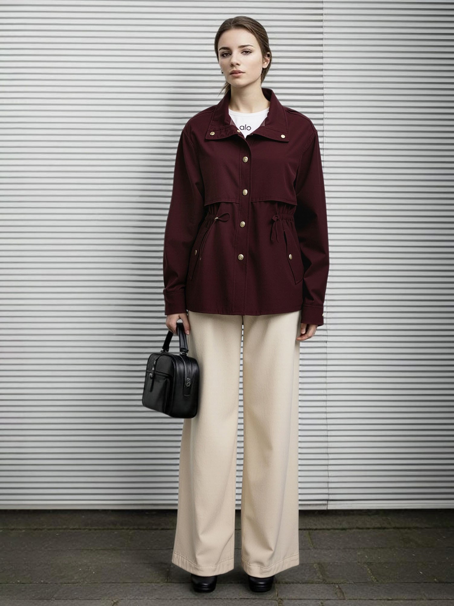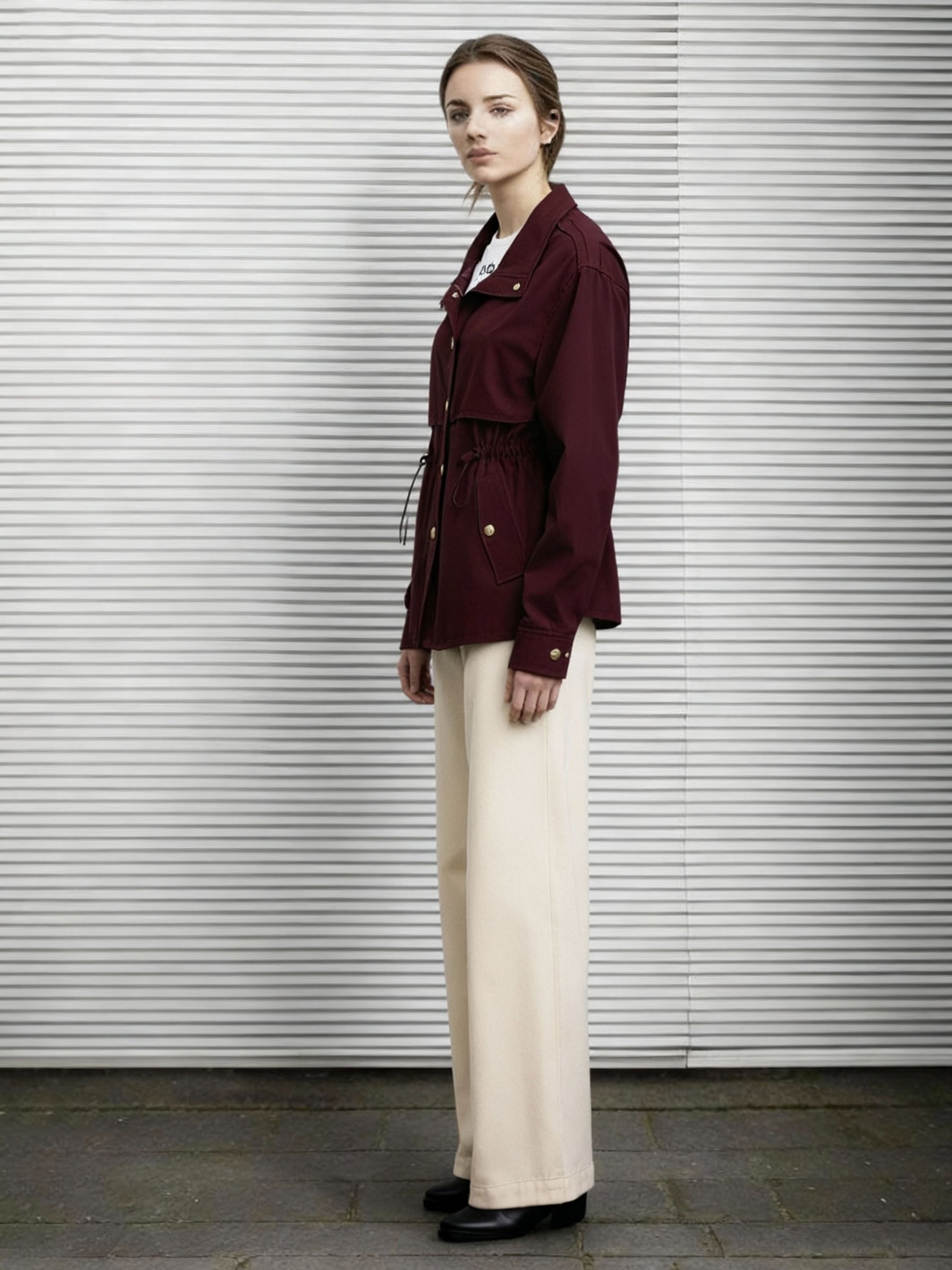 Conjunto de duas peças feminino estilo utilitário com cintura ajustada na cor bordô + calça bege de perna larga