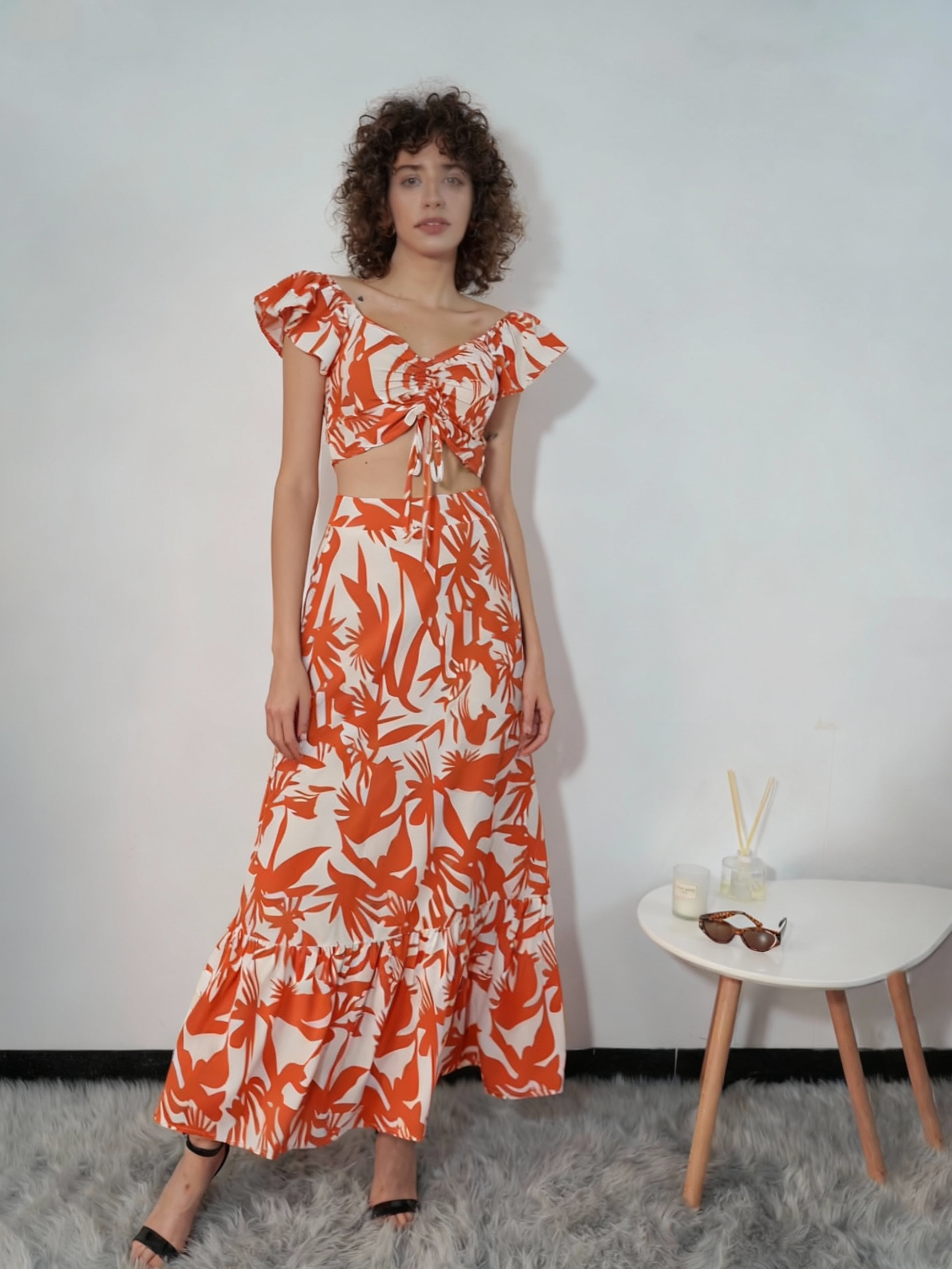 Vestido curto feminino com estampa floral colorida e verde, alças finas e babados, estilo festivo, cintura baixa